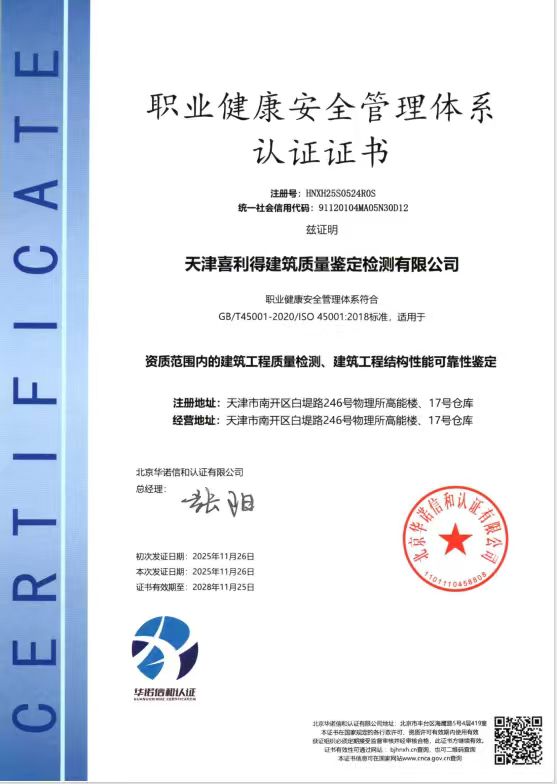 天津喜利得建筑質量鑒定檢測有限公司于2017年2月在天津市市場和質量監督管理委員會南開區市場和質量監督管理局注冊成立。于2018年8月18日取得天津市住房和城鄉建設委員會頒發的建設工程質量檢測機構資質證書。